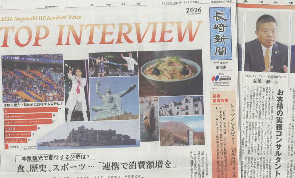 長崎新聞 2026年1月1日新年号第4部「新春経済特集トップインタビュー」にQ-bicソリューションズ株式会社 代表取締役 船橋修一のインタビューが掲載されました。